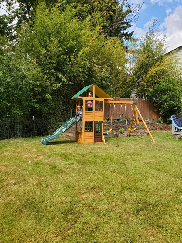 Backyard Discovery Woodridge Elite All Cedar Swing Set with Elevated Tunnel. Despite its compact footprint great for smaller back yards Halliwell packs a big punch with its extra-deep high-rail wave slide multi-colored rock climbing wall monkey bars for hanging and solid wood swing beam with two belt swings and a premium glider. Up to 7 cash back 1.